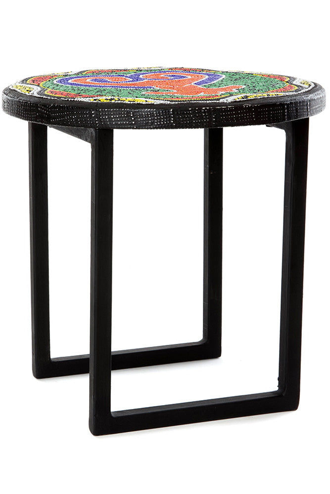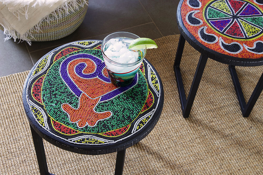 Ghanaian artisans adorn the tops of these gorgeous plant stands with an intricate mosaic of colorful strung glass beads. A perfect way to elevate potted plants, each stand includes a wooden seat atop a sturdy metal frame.