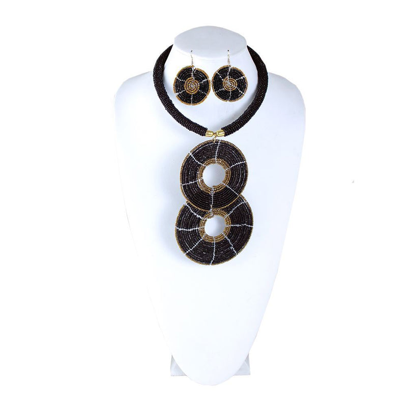 The beaded choker is black with gold points in the middle. Two large, interlocked, circular pendants hang from it.