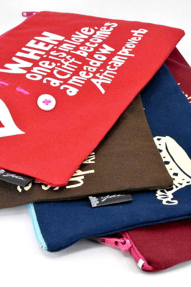 Beautifully screen printed, lined and finished with a contrasting zipper, this flat pouch showcases the African proverb, "When a woman rules, streams run uphill."