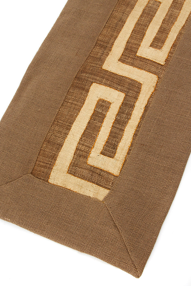 While she was trained to be a secretary and teacher, Joyce Mibenge turned her passion for tailoring into a thriving small business in Zambia. Within a frame of rustic hessian (jute) fabric, Joyce highlights Congo raffia panels in her uniquely African table runners.