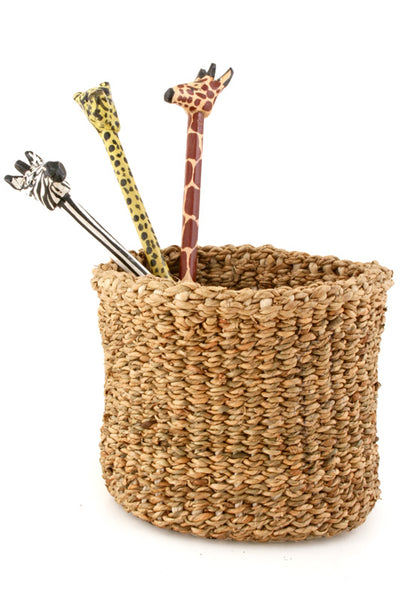 A group of artisans in the Gikomba carving cooperative society outside Nairobi, Kenya, hand carve fun safari animal heads from jacaranda wood, affix them to wooden pencils and hand paint bright animal print finishes.