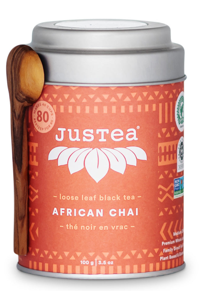 Each tin includes a hand-carved wooden spoon. Ingredients: Rainforest Alliance Kenyan Black tea, allspice, clove, fennel, cinnamon, licorice root, ginger, black pepper, rose petals