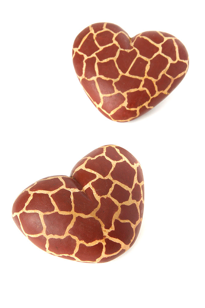 Kenyan wood carvers handcraft these unique keepsake hearts for safari enthusiasts and animal lovers. Each heart is hand carved from pale jacaranda wood and finished with a stained giraffe print finish.