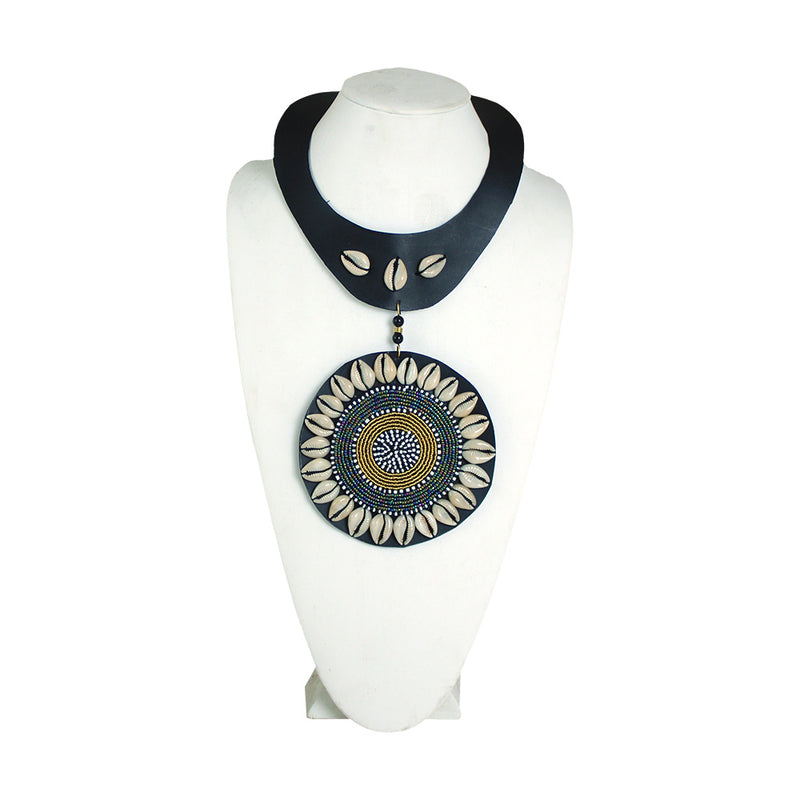 It has a large circular medallion hanging from it that has an outer layer of cowrie shells with a traditional African design of brown and blue beads on the inside.