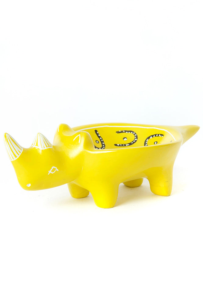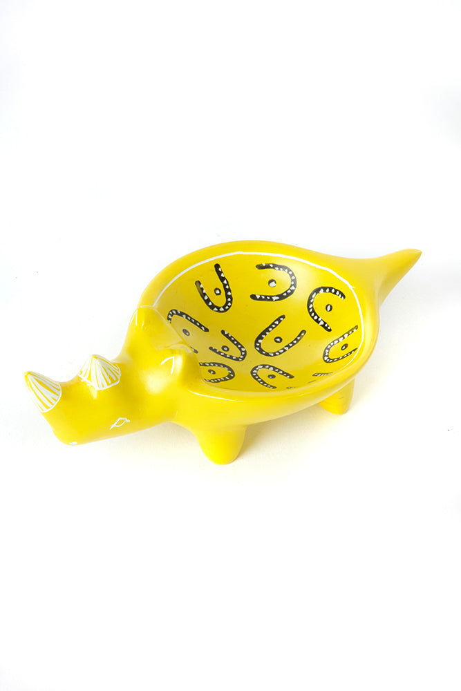 This sweet little rhino dish is hand carved from soft Kisii soapstone by artisans in Western Kenya, and finished with a hand-dyed speckled orange design by artisans in Nairobi.