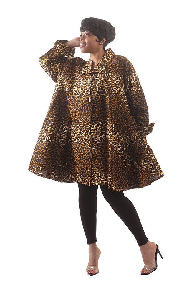 Bold and stylish, this Leopard Print Button Shirt will bring out your wild side! The shirt is a smock-style shirt with a large, pointed flat collar, elegant French cuffs on the sleeves, and decorative gold buttons down the front. It features a vibrant leopard print.