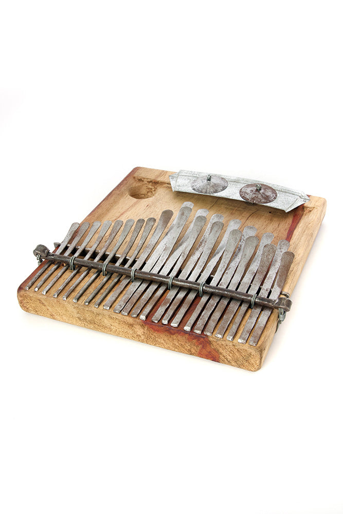 The hand-carved wooden base is affixed with wide recycled metal tines and resonators.
