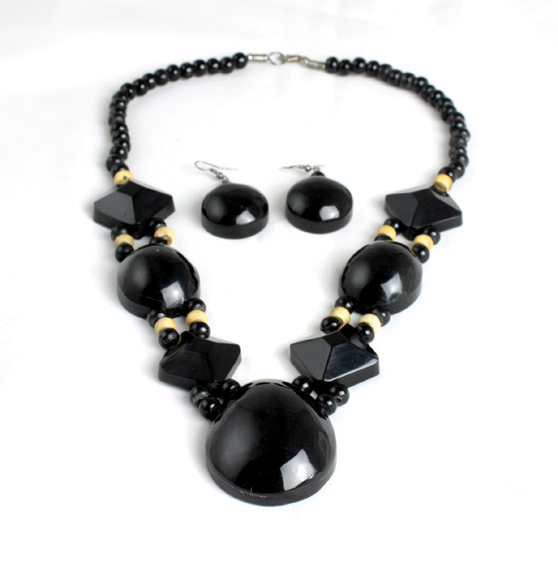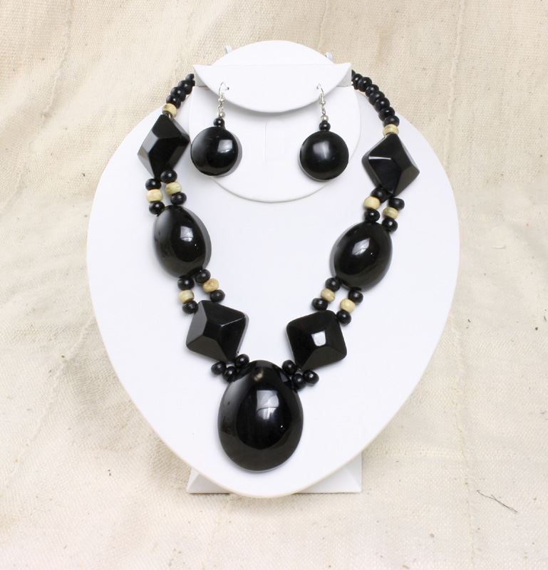 Large black bone pendant accented with pearl like beads and smaller pendants.