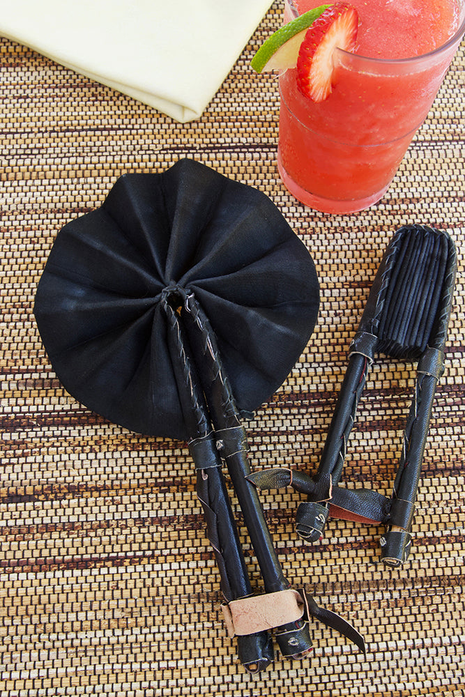 Coordinating dyed leather wraps a sturdy wooden handle and provides a closure for folding and storing the fan when not in use.