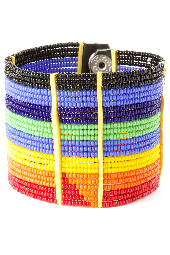Maasai artisans excel at creating stunning beaded adornments. Florence's modern interpretation of a Maasai cuff brings together a rainbow of colourful beads with cow bone spacers and a snapping leather closure.