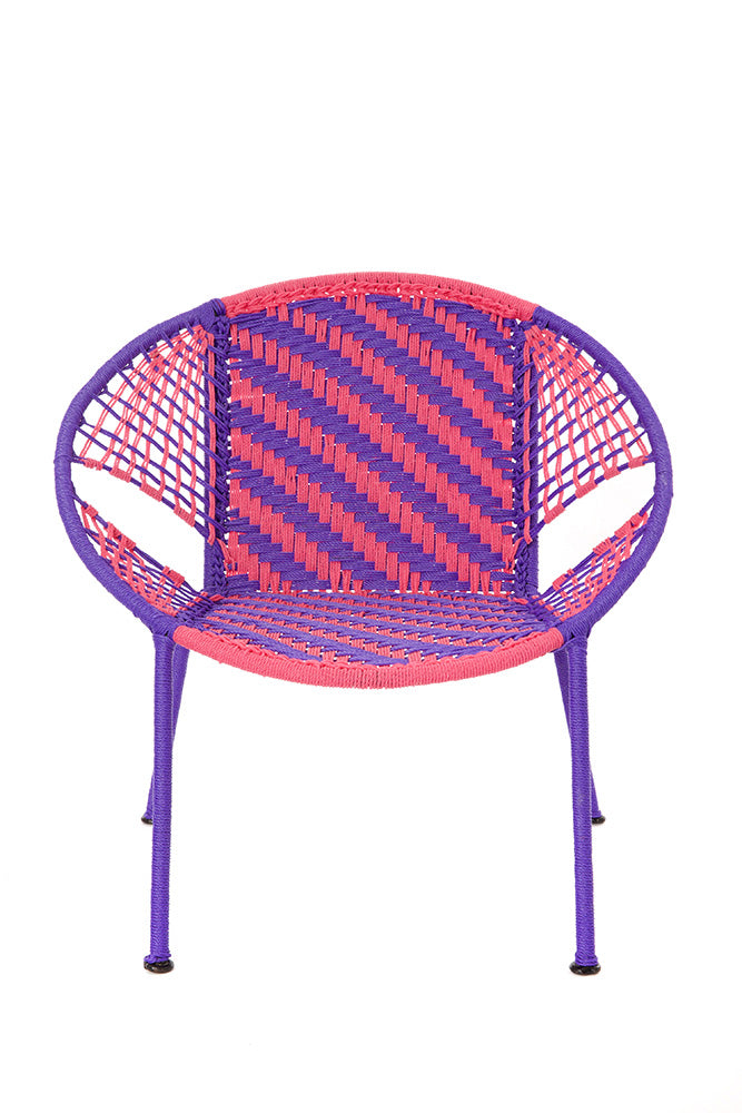 To create these darling little chairs, artisans in Senegal weave twisted plastic twine in a beautiful herringbone pattern onto sturdy welded metal frames. "Peekaboo" openings in the sides allow the chairs to be stacked.