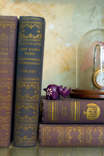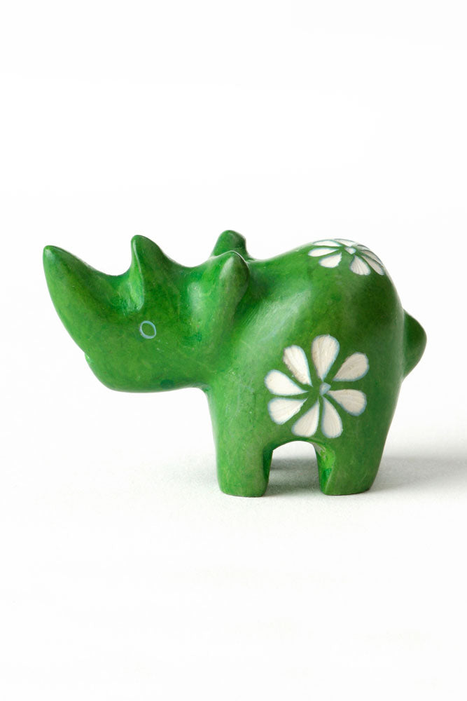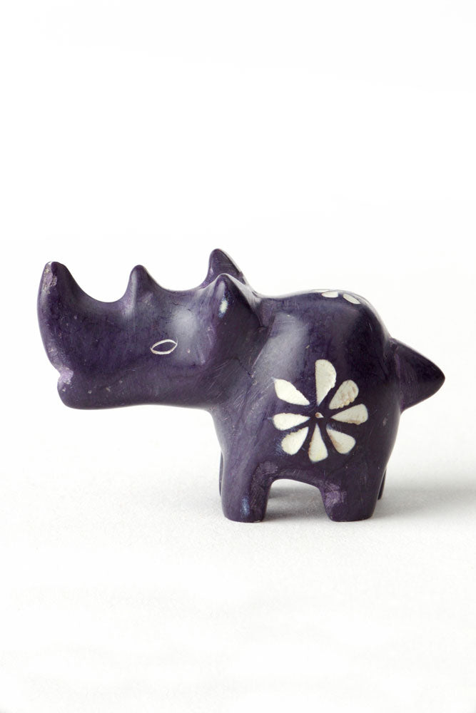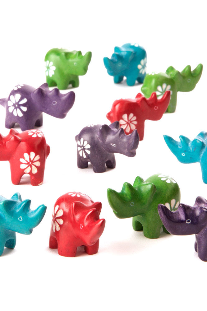 Kenyan artisans hand carve each miniature sculpture from soft kisii soapstone, then hand dye each rhino with bright non-toxic dyes.