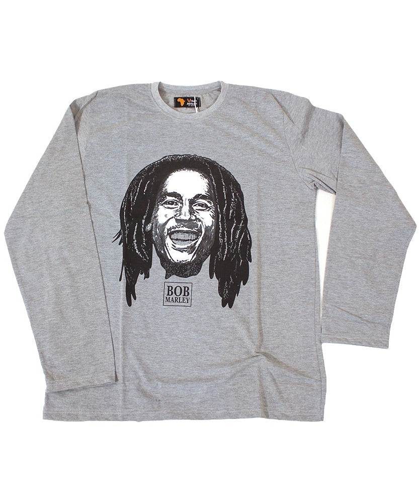 The long sleeve t-shirts have a graphic print of Bob Marley’s face on them with his name beneath his face.