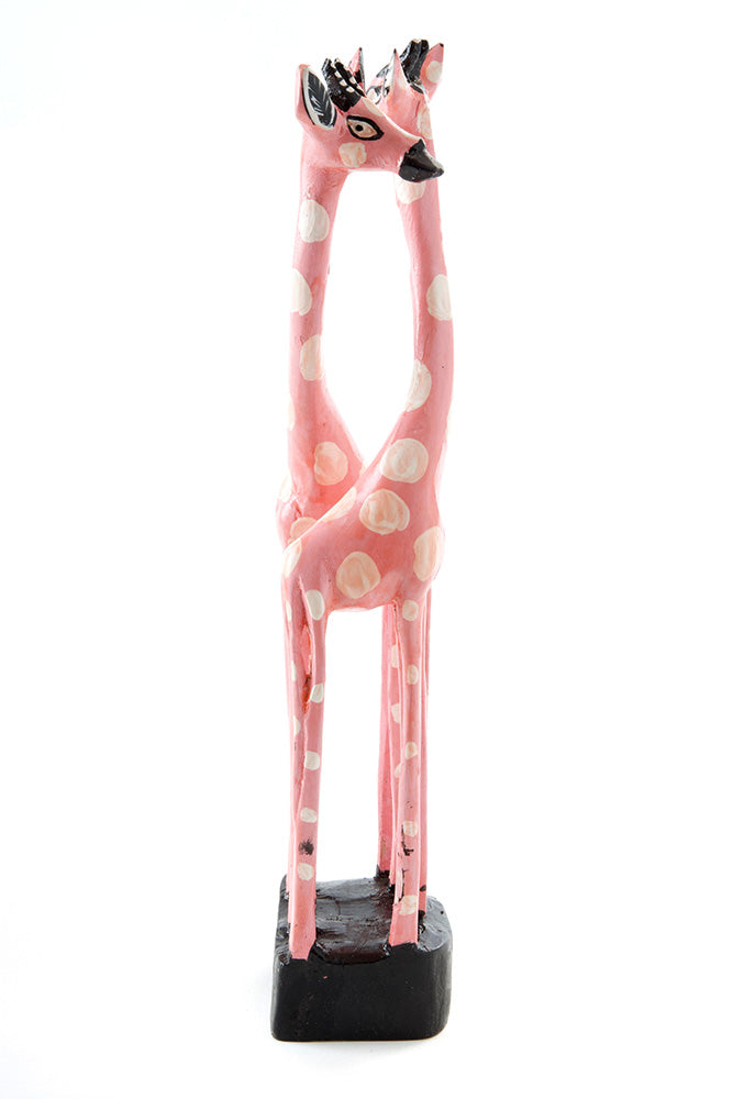 This vibrant sculpture showcases the talent of Kenyan wood carvers and painters. Using sustainably-sourced jacaranda wood, carvers craft the pair of giraffes with their necks crossed and heads facing opposite directions. A colorful coat of paint brightens each sculpture.