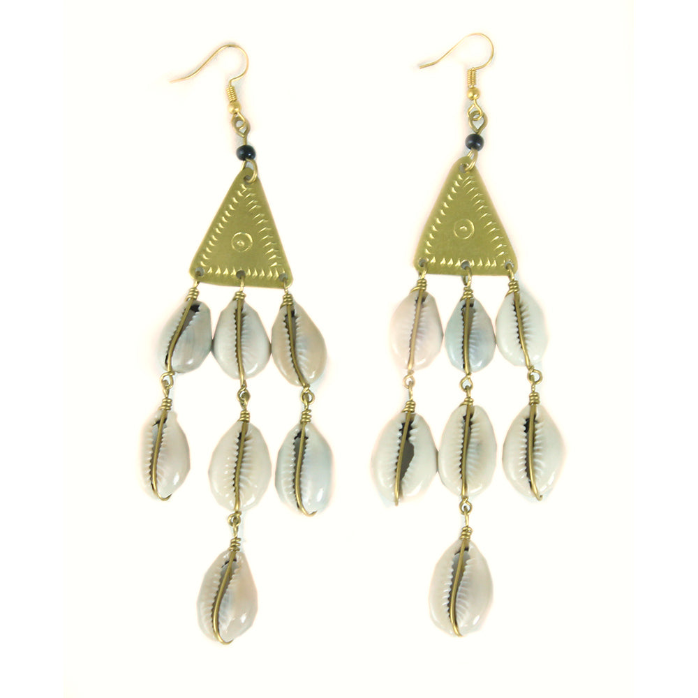 The brass earrings are triangular shaped with seven polished white cowrie shells dangling from them.